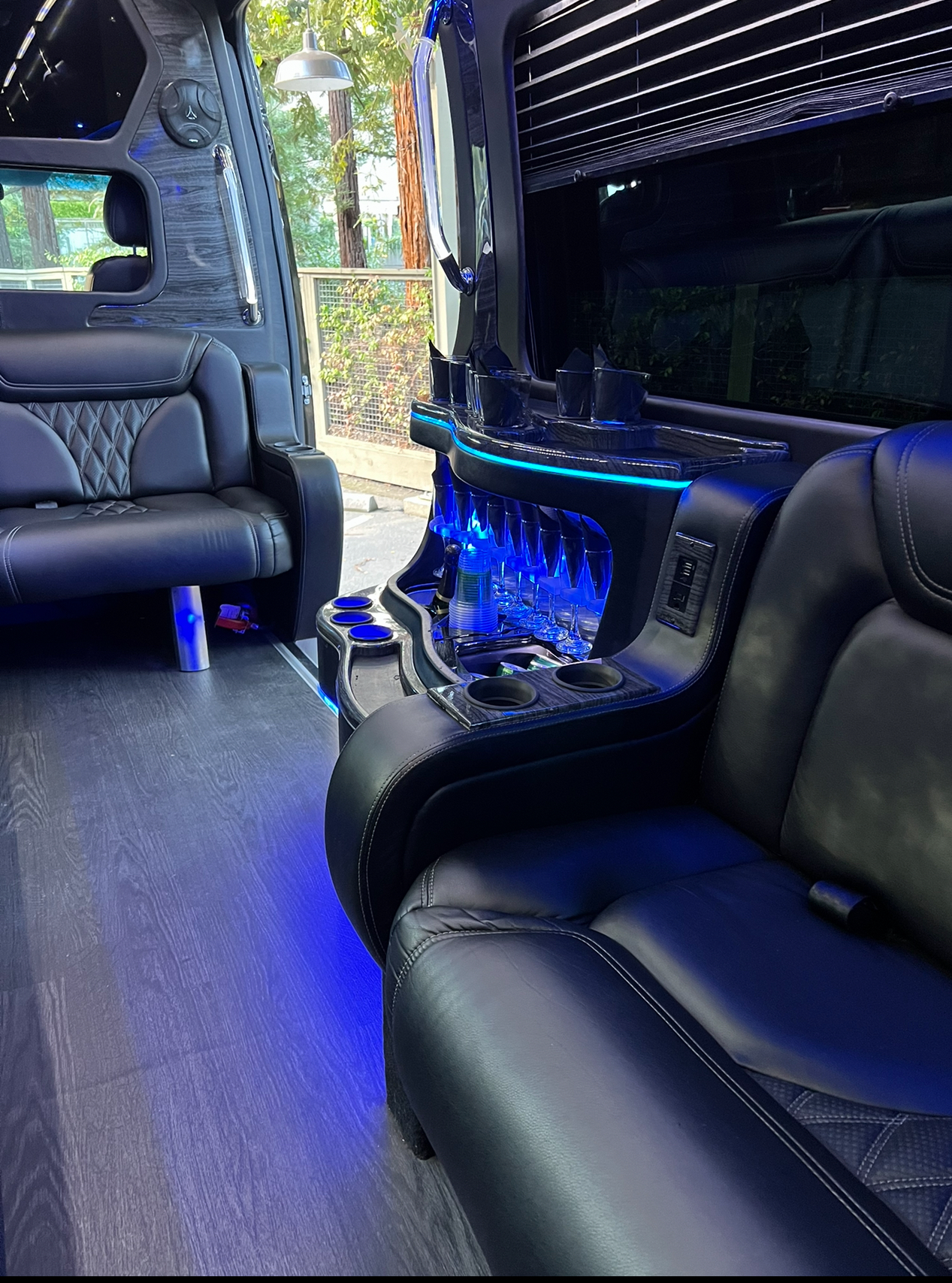 We proudly drive a Grech Motors built Mercedes-Benz Sprinter Limo Bus. With a beautiful and spacious interior – over 6 feet of height inside and a large sliding door for easy passenger loading and unloading.