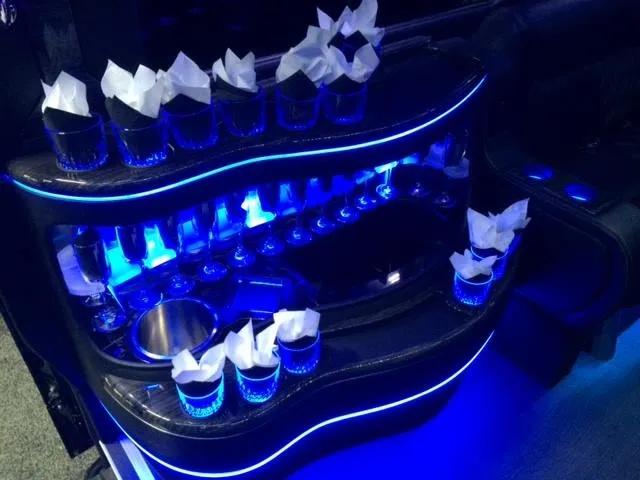 Our vehicles come with great features: an audio-visual system with stereo, CD player, DVD player, 2 monitors, USB connections, security partition, special lighting, and a full bar setup. Complimentary champagne, ice, bottled water, and sodas are included.